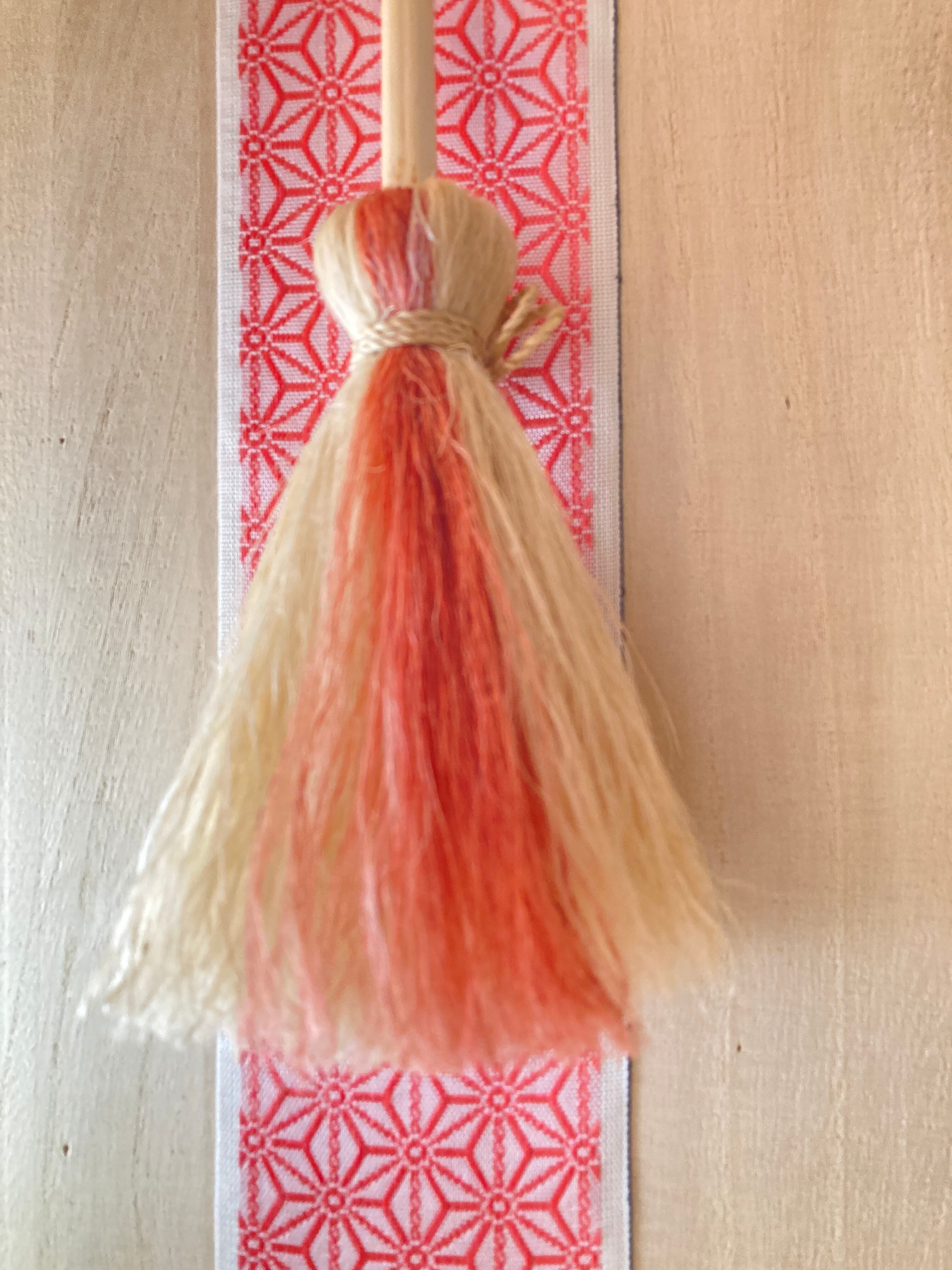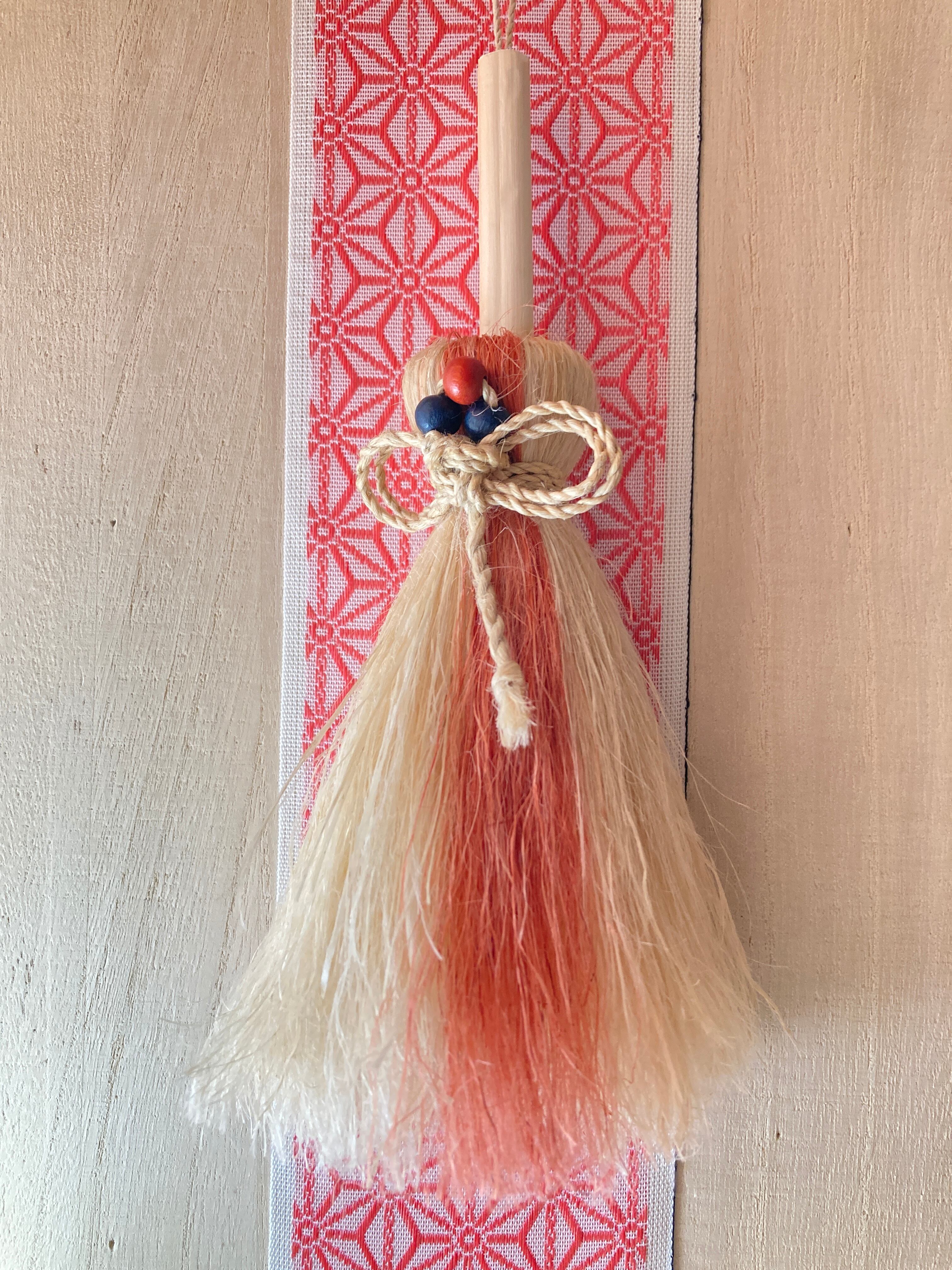 ピンク色は、茜染めの精麻を使用。ふわふわの手触りのほうきです。
